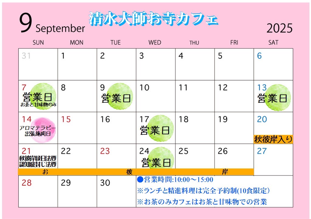 清水大師お寺カフェでは、完全予約制にてお任せランチ&精進料理をご用意できます。章香がほぼ一人で切り盛りをしておりますので、必ずお電話かまたはメール等にてお問い合わせの上、予約をしてからいらっしゃって下さいませ。
